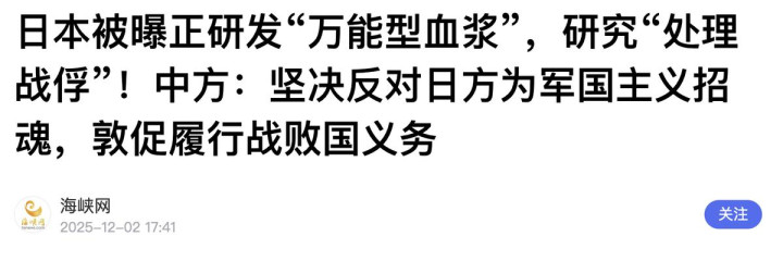 我们可以看到,自从高市早苗发出错误言论以来,日本右翼的态度其实是越来越强硬的,他们不仅加紧扩军,还开始研究“万能血浆”,恐怕是真的准备“备战”。
