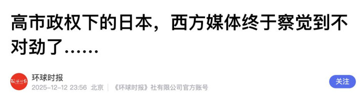 12月12日,媒体报道称,西方终于觉得高市早苗治下的日本开始“不对劲”了。简单来说,他们似乎也意识到了日本右翼抬头的趋势,并且觉得这并非是什么好事。